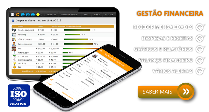 Organize a sua box/estúdio por categorias de despesas e receitas. Faça toda a gestão de pagamentos de mensalidades, seguro anual, folha de consumos e outros alertas de pagamento. Débito Direto ISO, balanços financeiros e emissão de faturas (opcional).