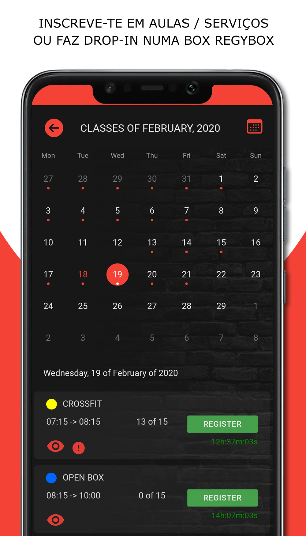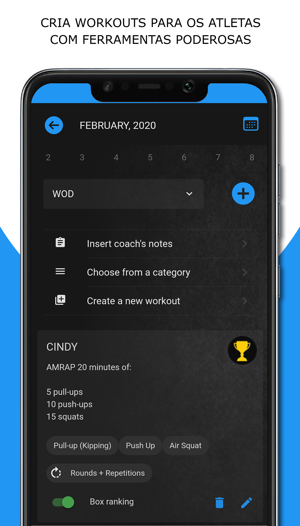 Crie o plano de aula/treino com exercícios e WODS pré-configurados. Associe movimentos e vídeos. Várias formas de registo de resultados (individual, pares, equipas, tempo, reps, rondas+reps, etc).
